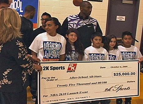 在洛杉磯的一個叫做《大家都是大明星課后輔導(dǎo)項(xiàng)目》的捐款儀式上,科比主持籃球電子游戲比賽,讓他的湖人隊(duì)同伴以及快艇隊(duì)的兩個球員戈登和卡曼大戰(zhàn)中學(xué)生,在游戲?qū)购,布萊恩特把一張兩萬五千美元的支票,捐給了洛杉磯輔導(dǎo)項(xiàng)目的執(zhí)行長坎波斯。