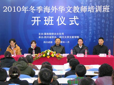 中新網(wǎng)1月6日電 據(jù)四川僑網(wǎng)消息,1月6日,由國(guó)務(wù)院僑辦文化司主辦,四川省僑辦和四川大學(xué)承辦的2010年冬季海外華文教師培訓(xùn)班在四川大學(xué)開班。這是四川省僑務(wù)系統(tǒng)首次承辦海外華文教師培訓(xùn)班。四川省僑辦副主任吳振西、四川大學(xué)文學(xué)與新聞學(xué)院院長(zhǎng)曹順慶出席開班儀式并致辭。四川大學(xué)文學(xué)與新聞學(xué)院黨委書記熊蘭主持儀式。