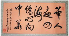 著名書(shū)法藝術(shù)家方向雄日前為華僑大學(xué)五十周年校慶題詞:“華人遍四!S心向中華”
