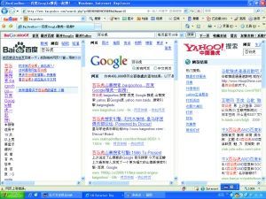 如果說搜索引擎的首頁讓人啼笑皆非的話,那顯示搜索結(jié)果的頁面卻又有些讓人“嘆服”山寨的創(chuàng)意。在記者嘗試著搜索一個(gè)關(guān)鍵詞后,一個(gè)集合了百度、谷歌、雅虎三個(gè)搜索引擎的組合頁面出現(xiàn)在屏幕上,頁面被分割成了三個(gè)板塊,分別對(duì)應(yīng)到三個(gè)正牌的搜索引擎。三大搜素引擎對(duì)關(guān)鍵詞的搜索結(jié)果全部羅列在一個(gè)頁面上,把屏幕擠得滿滿,看來寬屏化還真是大勢(shì)所趨。