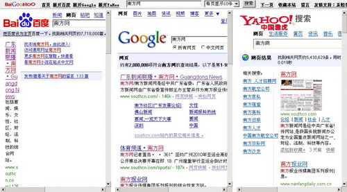 看到這個頁面,你一定會覺得很“雷”吧!還有更“雷”的在后面,為驗證搜索效果,記者嘗試輸入“南方網(wǎng)”進(jìn)去搜索,發(fā)現(xiàn)搜索出來的結(jié)果、頁面也是和百度、谷歌、雅虎一樣,只不過是把三大網(wǎng)站搜索結(jié)果進(jìn)行了并列排放。