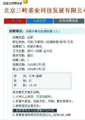 帖子里公布了一條轉(zhuǎn)自四川招聘·成都招聘網(wǎng)2月3日的一則招聘啟事。稱“北京三嶺基業(yè)科技發(fā)展有限公司招聘成都辦事處經(jīng)理助理,具體要求19~25歲的女性”。其中條件就包括了上述“暫時性伴侶”的雷人信息。隨后登錄成都招聘網(wǎng)發(fā)現(xiàn)該招聘啟事已被刪除。但根據(jù)發(fā)帖者提供的截屏,仍能看到相關(guān)內(nèi)容。