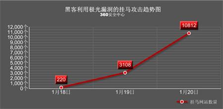 中新網(wǎng)1月21日電 IE瀏覽器新近曝出的“極光”0day漏洞正在引發(fā)空前迅猛的掛馬攻擊。來自360安全中心的監(jiān)控數(shù)據(jù)顯示,1月18日至1月20日三天內(nèi),黑客利用該漏洞掛馬的網(wǎng)站數(shù)量從220家猛增到10812家,相關(guān)掛馬網(wǎng)頁數(shù)量更是高達141856個。
