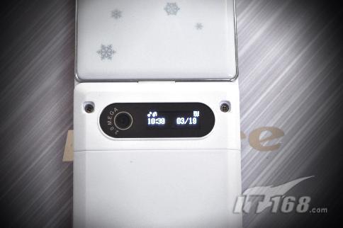 在koobee K75的后蓋上部,有一個(gè)小小的液晶屏幕,顯示效果優(yōu)良,可以讓你不用翻蓋就一目了然地知道是誰的來電,非常體貼的設(shè)計(jì)。