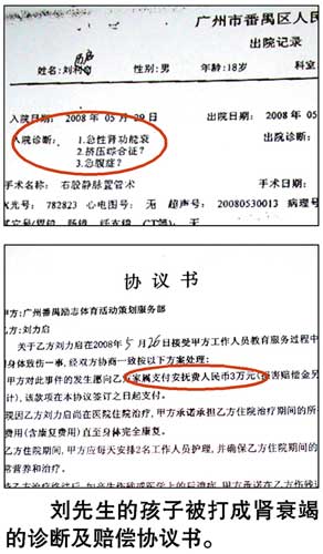 與楊先生同病相憐的還有東莞的劉先生,他的孩子在去年5月26日送進一個訓練營,訓練期也是三個月,繳費13100元,而30日孩子便被送進醫(yī)院,經(jīng)醫(yī)生診斷為毆打、缺乏飲用水造成的腎衰竭。劉先生說,訓練營的訓練內(nèi)容“基本上沒有心理輔導,只有少得可憐的法制教育,其余的全部都是‘生理輔導’和軍事訓練”。