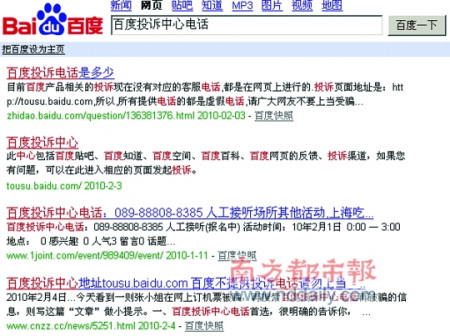 事態(tài)記者楊濤 報(bào)道 昨日,本報(bào)報(bào)道了山寨“百度投訴電話(huà)”被百度搜索置頂?shù)碾x奇事件,昨日,記者追訪(fǎng)此事時(shí)發(fā)現(xiàn),電話(huà)區(qū)號(hào)為“0898”的山寨“百度投訴中心”已經(jīng)不再置頂,但昨日晚間搜索時(shí),該網(wǎng)站仍然位列搜索結(jié)果的第三位。只是隨后的一條搜索結(jié)果提醒用戶(hù),“百度不提供投訴電話(huà),請(qǐng)勿上當(dāng)”。被騙的張小姐得知此消息后亦哭笑不得。她表示對(duì)此事報(bào)警的目的不在于索賠,但網(wǎng)絡(luò)的管理實(shí)在有待加強(qiáng)。