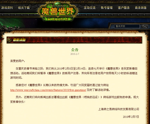 網(wǎng)易昨天是在一篇魔獸世界游戲內(nèi)活動的公告中披露上述消息的。公告稱將從2010年2月8日至2月14日,連續(xù)七天舉行《魔獸世界》老玩家新春回饋活動;顒悠陂g將暫!赌ЙF世界》的新用戶注冊,并向所有注冊老用戶按照每天3小時的標(biāo)準(zhǔn)贈送游戲時間。