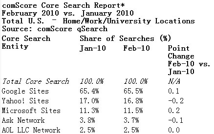 北京時間3月11日消息,據國外媒體報道,互聯(lián)網調研公司comScore今天發(fā)布了美國搜索市場月度調查分析,該分析顯示2010年2月美國核心搜索量145億次,由于二月份天數(shù)較少,環(huán)比下降5%。其中谷歌網站占據了搜索市場份額的65.5%,必應略有上升,而雅虎則繼續(xù)下滑。值得關注的是,來自Facebook的搜索請求大增10%,在其他主要網站的總搜索請求均有所下降的背景下,這一業(yè)績十分突出。