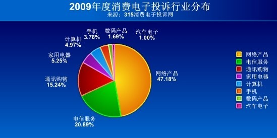 中新網(wǎng)3月12日電 中國電子商會頒布《2009年度消費電子產(chǎn)業(yè)售后服務藍皮書》(下稱“藍皮書”):《藍皮書》顯示:2009年,網(wǎng)絡產(chǎn)品以105438宗投訴居榜首位置,占據(jù)消費電子投訴的半壁江山,所占比例高達47.18%。排在二、三位的行業(yè)分別是電信服務和通訊購物,這三大行業(yè)的投訴量占了消費電子投訴量的八成以上。