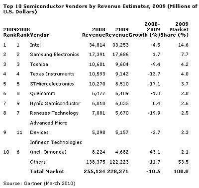 2009年10大半導(dǎo)體廠商 英特爾連續(xù)18年稱冠