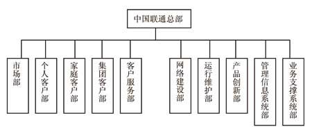 借電信重組契機,中國聯(lián)通也對組織架構進行了調整。在重組之前,原中國聯(lián)通的前臺部門有G網(wǎng)經(jīng)營部、增值業(yè)務部、數(shù)據(jù)固定業(yè)務部等,原中國網(wǎng)通有增值業(yè)務中心、公話業(yè)務管理中心、綜合信息業(yè)務中心、區(qū)域銷售管理中心等;重組之后,中國聯(lián)通成立了個人客戶部、家庭客戶部、集團客戶部,這些部門與市場部級別平行,具體如圖所示。