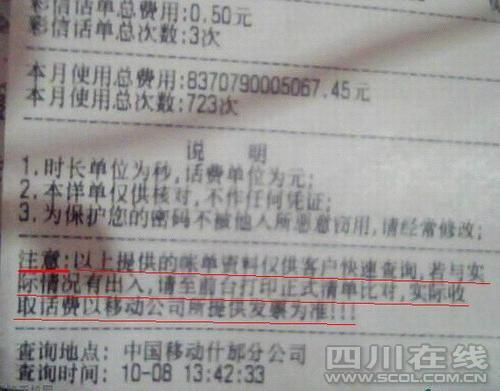 針對打印話單出錯的現(xiàn)象,中國移動客服人員表示自助打印話單機提供的話費清單僅提供用戶的通話、短信、上網等業(yè)務的消費情況供用戶參考,最終的話費應以在營業(yè)柜臺打印的話費單為準。