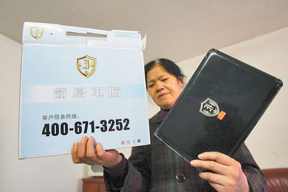昨日,記者在大坪金銀街的湯大媽家里看到了這臺(tái)上網(wǎng)本。包裹上顯示的是由江蘇昆山市物流公司遞送的“10寸黑簡(jiǎn)易電腦+蘋(píng)果手機(jī)+DC”,沒(méi)有發(fā)貨的公司名稱(chēng),只留有電話(huà)號(hào)碼400-671-3252。這臺(tái)黑色的上網(wǎng)本是塑料外殼,很輕很薄,沒(méi)有產(chǎn)品名稱(chēng),外面蓋上有“簡(jiǎn)易電腦”幾個(gè)字,側(cè)邊有幾個(gè)USB 接口。