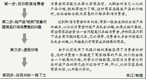 在中關(guān)村發(fā)生的大多數(shù)價格欺詐,都有著一種固定的套路。林漢鐘把這種欺騙手法歸結(jié)為“四步”。