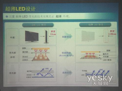 再說(shuō)背光源與側(cè)光源的區(qū)別,根據(jù)上圖我們可以看出,與傳統(tǒng)LCD光源組件和投射原理相比,LED側(cè)光源由機(jī)身兩側(cè)發(fā)出光源,通過(guò)三星內(nèi)置的高透光率的導(dǎo)光板的作用,使光線投射到面板上。限制LCD厚度最大的就是熒光燈的厚度,側(cè)光源位于兩側(cè)的投射位置,使得其并不占據(jù)電視厚度的空間。