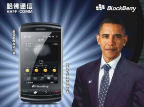 據(jù)美國媒體報道,日前,美國總統(tǒng)巴拉克奧巴馬的形象出現(xiàn)在中國一款仿黑莓BlackBerry Storm 9500手機(jī)的宣傳海報上。