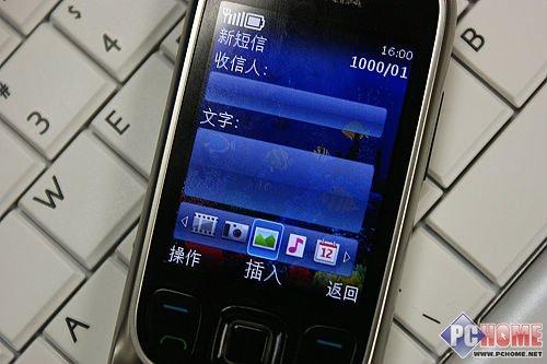 在短信輸入的設(shè)計(jì)上,6303C將短信和彩信的模塊合并在一起,我們注意到在文字輸入?yún)^(qū)域下方,就是插入多媒體資料的圖標(biāo),由此將短信自動(dòng)切換為彩信,應(yīng)用非常方便。6303C還是沿用了傳統(tǒng)的T9輸入法,相比全鍵盤的機(jī)型來說,數(shù)字鍵盤輸入速度一般,但它的按鍵的手感不錯(cuò),長(zhǎng)時(shí)間使用并不會(huì)覺得疲憊。