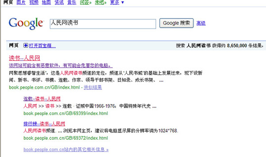 這兩天,你如果通過谷歌檢索“人民網(wǎng)讀書頻道”,檢索結(jié)果里會發(fā)現(xiàn)這樣的提示:“該網(wǎng)站可能含有惡意軟件,有可能會危害您的電腦。”