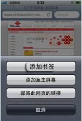 ⑹網(wǎng)頁(yè)管理界面主要包括“添加書(shū)簽”、“添加制主屏幕”和“郵寄此網(wǎng)頁(yè)的鏈接”三個(gè)選擇。選擇“添加書(shū)簽”按鈕,可將該網(wǎng)頁(yè)的網(wǎng)址加到書(shū)簽列表中;選擇“添加制主屏幕”按鈕,可形成屏幕快捷鍵;選擇“郵寄此網(wǎng)頁(yè)的鏈接”可將該網(wǎng)頁(yè)的網(wǎng)址發(fā)送給別人。