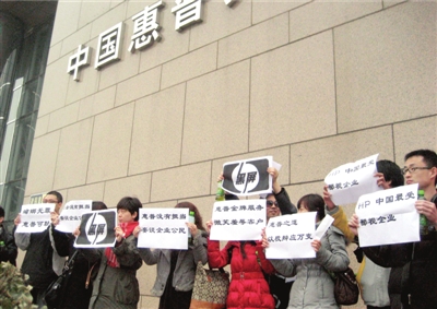 當(dāng)天上午10點(diǎn)半左右,在國貿(mào)橋東南角的中國惠普大廈門前,十余名消費(fèi)者手舉自制的紙牌抗議,引來路人圍觀。紙牌上寫著“蟑螂無罪惠普可恥”、“HP,中國最受鄙視企業(yè)”、“惠普之道,以狡辯應(yīng)萬變”等口號(hào)。抗議進(jìn)行了10分鐘左右,消費(fèi)者來到中國惠普大廈的8層,看到“惠普解決方案體驗(yàn)中心”的招牌后,消費(fèi)者又舉起紙牌進(jìn)行抗議,并要求與售后總監(jiān)談判。11點(diǎn)左右,惠普售后總監(jiān)陳女士來到現(xiàn)場。