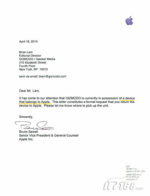 在與軟件工程師鮑威爾通過電話之后,蘋果公司首席法律顧問兼主管法律和政府事務(wù)的高級副總裁Bruce Sewell(此前是Intel的法律顧問)又給Gizmodo網(wǎng)站的編輯Brian Lam發(fā)送了一封電子郵件,信的內(nèi)容是:Gizmodo網(wǎng)站拿到的那臺iPhone屬于蘋果公司,現(xiàn)正式要求你們將其歸還給蘋果,請告知取回的地址。