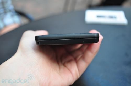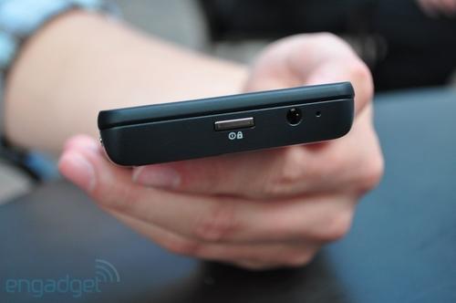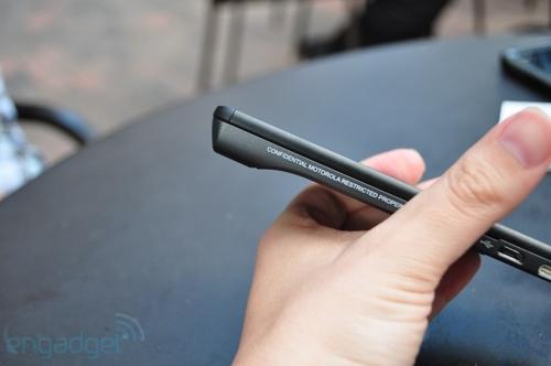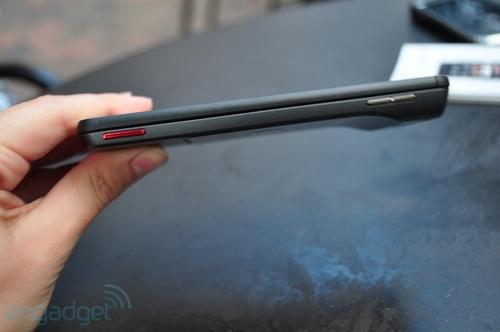 摩托羅拉Droid X的機身背部并非采用了和iPhone 4相同的平面式設計,從這一角度我們可以很清楚的看到機頭部分明顯凸出,厚度比其它區(qū)域都要多一些。