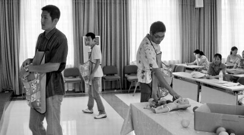 掀開他們的寬大上衣,發(fā)現(xiàn)每一個(gè)人都在肚子上綁上了一個(gè)沙袋,里面裝著5公斤重的沙子,體驗(yàn)著孕婦們?cè)谠挟a(chǎn)期中所需要掌握和學(xué)習(xí)的所有知識(shí),以及因?yàn)閼言卸鴰?lái)的種種生活不便。