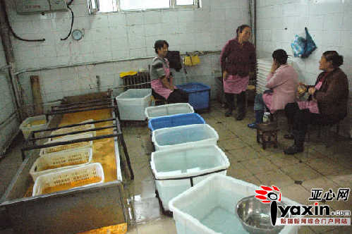記者謊稱找老板商談合作事宜,一進(jìn)大門就看到地上布滿了污水和油漬,5名洗碗工坐在小板凳上,手拿抹布在跟前的大盆子里清洗餐具。既便盆里的水已變得渾濁,洗碗工也沒(méi)有換水。