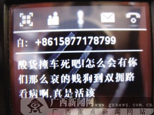 周女士家人手機上接到的其中一條侮辱短信。劉瓊攝