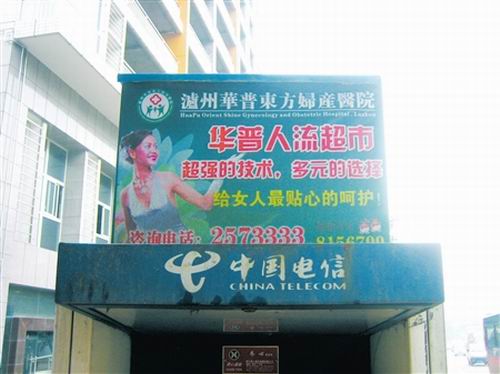本學期開學以來,一位瀘州十五中女生家長多次打來電話,反映學校附近人行道電話亭上的華普東方醫(yī)院廣告涉嫌違規(guī)!疤幌裨捔,他們居然打出‘人流超市’的宣傳。是不是說‘人流’就像進商場買東西一樣簡單嘛?”該家長認為,人工流產是一件對女性身體傷害極大的事情,年輕女性應該盡量避免。醫(yī)院如此打出人流廣告,是暗示人流像在超市購買商品一樣簡單,對女性尤其是少女健康不利。“他們還把廣告打在學校附近,對正處于成長發(fā)育期的孩子非常不利。我真擔心女兒受到影響!”接到家長反映后,記者在城區(qū)連江路十五中附近和前進中路一帶發(fā)現(xiàn)了這些廣告。廣告都發(fā)布在人行道電話亭頂部,約兩平方米大小,除了宣傳醫(yī)院名稱、超強技術等內容外,“華普人流超市”作為廣告主體內容顯得格外顯眼。