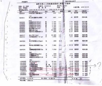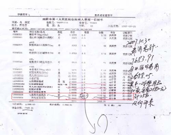 李冰拿著一厚厚一沓子住院清單說(shuō),每次住院時(shí)交100元押金后,病人即可使用醫(yī)院提供的被褥、茶瓶等物品,此外連一圈衛(wèi)生紙他們也沒(méi)用過(guò),根本不知道價(jià)值10元錢(qián)的一次性用品是什么,何況一天竟用了258套!李冰還用筆把下列她認(rèn)為沒(méi)有消費(fèi)的項(xiàng)目作了標(biāo)記:2007年11月8日,開(kāi)蜂蜜5瓶,計(jì)費(fèi)115元;奇正消痛貼10盒,計(jì)費(fèi)142元;2008年1月6日,開(kāi)山甲若干,費(fèi)用552.50元;2007年11月8日陪護(hù)床位20張;2008年5月4日陪護(hù)床位15張。