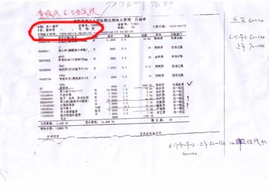 第一份清單是她母親席桂芬的。席桂芬今年80歲,是南陽(yáng)市商業(yè)局的離退休干部,多年來(lái)患有高血壓、糖尿病、老年癡呆癥等,近年來(lái)經(jīng)常在南陽(yáng)市第三人民醫(yī)院住院治療。清單顯示的時(shí)間為“2007年10月29日至30日(前日零點(diǎn)至次日零點(diǎn),下同)”,李冰特意在兩行費(fèi)用上用紅筆作了標(biāo)記:一次性用品,單價(jià)10元,套數(shù)258套,合計(jì)金額2580元,類別為其他費(fèi)用。也就是說(shuō),在醫(yī)療費(fèi)用之外,席桂芬這一天揮霍掉了258套一次性用品。第二份清單上,時(shí)間為:2008年6月14日,其母親的性別變成了“男”。