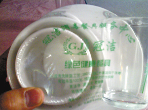 這兩家產品一個名叫“冠潔”,一個名叫“天康”。飯店老板告訴記者,名為“冠潔”的餐具是最近才進入市場的,而名叫“天康”的餐具則已經有了一段時間!肮跐嵅途叩睦习迨俏覀兊V區(qū)衛(wèi)生局長的丈夫,他親自登門推銷,我們也不敢說什么,只好用一些。”