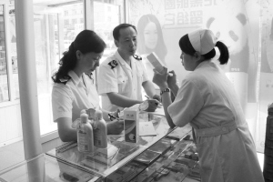 昨日10時(shí)許,記者與朝陽區(qū)衛(wèi)生局衛(wèi)生監(jiān)督所的執(zhí)法人員來到位于南湖大路一工地附近的瑞豐大藥房,這是一間規(guī)模較小的藥房,但藥房里擺放的藥品種類卻不少,據(jù)藥房?jī)?nèi)的售藥人員介紹,店里的消毒藥主要賣給附近的農(nóng)民工。