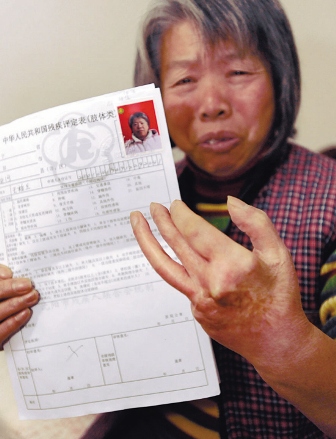 若干年前的一次工傷,讓沈河區(qū)北二經(jīng)街的居民王桂蘭成為國家三級肢殘。但這一事實在上周五被“改變”了,在經(jīng)歷了一次新殘疾證換證的例行體檢之后,60歲的王桂蘭被醫(yī)生告知,她已經(jīng)是“正常人”了。這一結果讓王桂蘭大惑不解,她舉著殘廢的左手質問醫(yī)生,“為啥?”醫(yī)生回答:“你必須手指頭全沒了才能算殘疾!