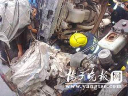 事故發(fā)生后,潤(rùn)州大隊(duì)七里甸消防中隊(duì)10名官兵奉命趕往現(xiàn)場(chǎng)救援,潤(rùn)州交巡警迅速趕到現(xiàn)場(chǎng)指揮疏散交通,很快120急救車也趕至現(xiàn)場(chǎng)。10分鐘后,救援官兵到達(dá)現(xiàn)場(chǎng),發(fā)現(xiàn)拖拉機(jī)簡(jiǎn)易駕駛室已嚴(yán)重變形,被困司機(jī)滿臉血污動(dòng)彈不得,不住發(fā)出痛苦的呻吟聲。救援指揮員查看了現(xiàn)場(chǎng)情況,發(fā)現(xiàn)救援關(guān)鍵在貨車車頭,只有將壓在拖拉機(jī)上的車頭拉開(kāi),才能破拆救援,但要將車頭拉離,必須要?jiǎng)佑么笮偷踯,而且需要一定時(shí)間。面對(duì)不斷呻吟的被困司機(jī),指揮員當(dāng)即請(qǐng)120急救醫(yī)生為其輸液,以減少司機(jī)的痛楚。