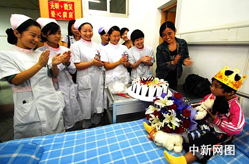 “祝你生日快樂, 祝你生日快樂”, 9月28日上午9時(shí)許,從江西九江學(xué)院附屬醫(yī)院住院部八樓的光明.微笑愛心病房里傳出歡快的生日祝福歌,醫(yī)護(hù)人員正在給小患者小胡慶祝生日。