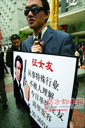 墨鏡、領(lǐng)帶、藍(lán)灰西服,一手拿把玩具左輪手槍,一手舉個(gè)紙牌站在深圳市華強(qiáng)北對看客頻頻點(diǎn)頭致意。昨日,深圳一男子自稱在成人用品行業(yè)工作,找不到女友,特意打扮成這個(gè)“007造型”,舉牌征女友。