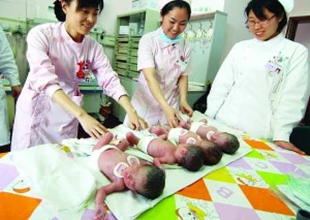 6月3日下午2時15分,伴隨著一聲聲嬰兒的啼哭,兩“龍”兩“鳳”四胞胎相繼在青醫(yī)附院婦產科誕生。孩子們的父親王磊為其取名“歡歡、迎迎、奧奧、運運”,連起來就是“歡迎奧運”,據了解,四兄妹是自然受孕的雙卵四胞胎,目前情況基本穩(wěn)定。