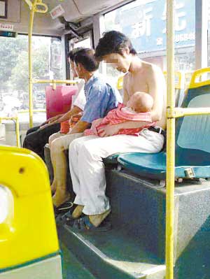 昨天(24日)下午4時(shí)左右,在廣東省東莞36路公交車上,由于車內(nèi)空調(diào)涼爽,患感冒的小女嬰一上車就打起瞌睡,父親阿勇(化名)趕忙脫下襯衣包裹住懷中的女兒。乘客對(duì)赤膊的阿勇贊彈不一,有男乘客認(rèn)為阿勇脫衣裹蓋女兒是父愛(ài)的表現(xiàn),無(wú)可厚非;有女乘客則認(rèn)為阿勇在公眾場(chǎng)合打赤膊不雅,影響了東莞的城市文明形象。