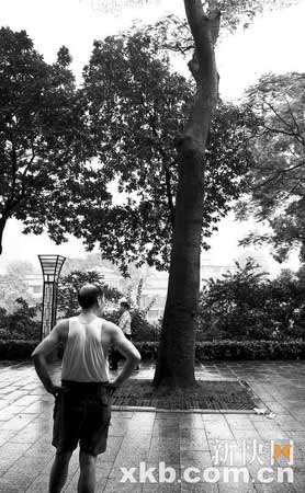 下午5時25分,記者趕到事發(fā)現(xiàn)場,在離公園入口約150米處的一棵樹下有大一攤血跡,旁邊有兩個塑料袋。這棵鳳凰樹高約20米、直徑約20厘米,沒有明顯雷擊痕跡。幾位市民正拍著胸口在驚嘆自己險些遭到雷擊。