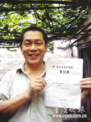 蔣必忠的愿望在7月24日這天變成了現(xiàn)實。那天下午,當(dāng)他躺在病床上,用顫抖的右手在那張《重慶市遺體捐獻登記表》上歪歪斜斜簽下自己的名字后,他長長地舒了口氣。就這樣,這個59歲的直腸癌晚期患者,成為在北碚區(qū)紅十字會登記的首個農(nóng)民遺體捐獻者。