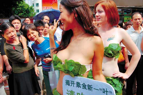 昨天下午2時(shí),北京路商業(yè)步行街,兩位自稱來自善待動(dòng)物組織的外國女孩僅用菜葉擋住身體關(guān)鍵部位,大方招搖過市。但見兩位“夏娃”一路高舉標(biāo)語牌,大聲用生硬中文高喊“請(qǐng)吃素吧”。據(jù)了解,這兩位性感女郎來自韓國和加拿大。