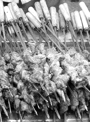 “一些燒烤店賣的羊肉串有一部分是豬肉的,只不過是用了一種叫‘羊肉精’的調(diào)料‘拌’的,用這種‘羊肉精’浸泡過的豬肉帶有羊肉味。制作過程中也有很多貓膩兒。要選肥瘦相間的豬肉,因為這樣的豬肉和羊肉外觀比較相似,吃起來比較香,口感也好。把原料切成小方塊,每一塊都要肥瘦兼顧,拌入十多種作料后,就制成了‘羊肉串’!边@名廚師說。