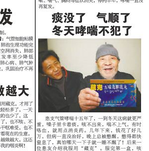 “患友介紹我服用了‘藏克’。服完第一盒,咳嗽、胸悶就緩解多了!弊蛱,看著我市某報上的一則藥品廣告,90歲高齡的老人張治欽感到納悶,“我從來沒得過這病,卻上了該藥的宣傳廣告!