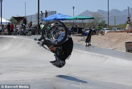 現(xiàn)年16歲的亞倫·佛斯靈漢姆(Aaron Fotheringham)被朋友們稱作“車輪” 。1991年11月出生在美國內(nèi)華達州的拉斯維加斯的他,患有脊柱分裂的先天疾病, 從3歲起就不得不依靠輪椅生活。但是,他卻成為了輪椅上完成后空翻高難度動作的第一人(目前唯一的一個),他也因這一壯舉在2008年10月入選了吉尼斯世界紀錄。