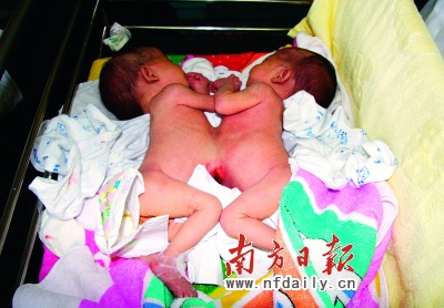 昨天,一對(duì)出生83天的連體女?huà)?如右圖,丁玎向雨航攝),經(jīng)過(guò)3小時(shí)20分鐘的手術(shù),在深圳市兒童醫(yī)院順利進(jìn)行了分離。據(jù)悉,這是市兒童醫(yī)院順利完成的第2例連體嬰兒分離術(shù),也是深圳市第2例。