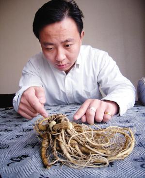 記者看到,這棵參的根須部分是卷成一團(tuán)的,在主根旁還長著四根較粗的根,這些根上還有許多細(xì)長的須,顏色為土黃色。以團(tuán)狀出現(xiàn)的山參長約20厘米,寬約10厘米,根須上有一些小疙瘩狀的小結(jié)。李先生說,就為了鑒定這棵山參的價值,幾天前他們特意來到北京。他們曾拿著山參的照片來到北京一個知名藥堂,藥堂里的一位藥材專家告訴他們這棵參至少有百歲高齡,幾個較粗的根莖可以稱為“四世同堂”,可以說十分罕見,這讓他們對山參的價值信心倍增。