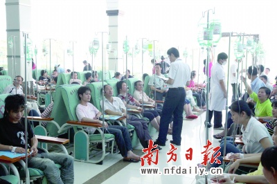 昨天上午11時許,記者趕到樟木頭醫(yī)院時,該院的輸液大廳坐滿了光明毛織廠員工,他們正在打點滴。樟木頭鎮(zhèn)政府的幾位領導正在現(xiàn)場問寒問暖。據(jù)記者觀察,該輸液大廳的8排輸液椅子都坐滿病號,共100多人,其中少數(shù)人不是光明毛織廠的員工。