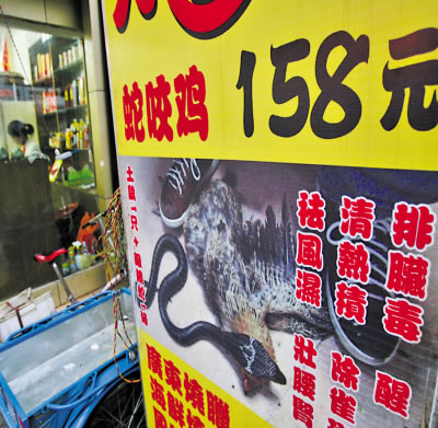 “打死我都不敢吃!”市民劉先生在黃泥塝看到某餐館推出的“蛇咬雞”招牌后說,這些吃法太怪了。劉先生介紹,招牌上還說,吃“蛇咬雞”可以醒腦、除雀斑、排臟毒、祛風(fēng)濕等!斑@不僅太殘忍,太血腥,也不道德。”張女士說,希望這僅僅是個(gè)別餐館吸引顧客而搞的噱頭。